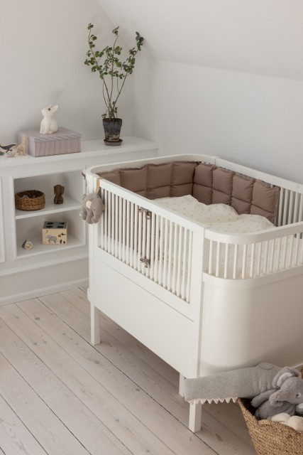 The Kapok baby bumper fits the Sebra Bed, Baby & Jr., with the base in the upper position and a standard crib measuring 60 x 120 cm. You can adjust the bumper to fit a smaller crib by overlapping it, for example, at the foot end. The tie straps allow you to secure it to the crib at the top and bottom.